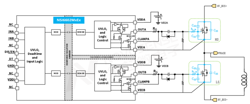 NSI6602MxEx与NSI6602功能框图对比5A米勒钳位功能助力半桥电路安全可靠